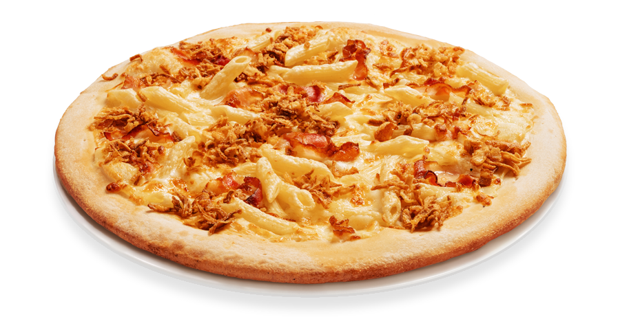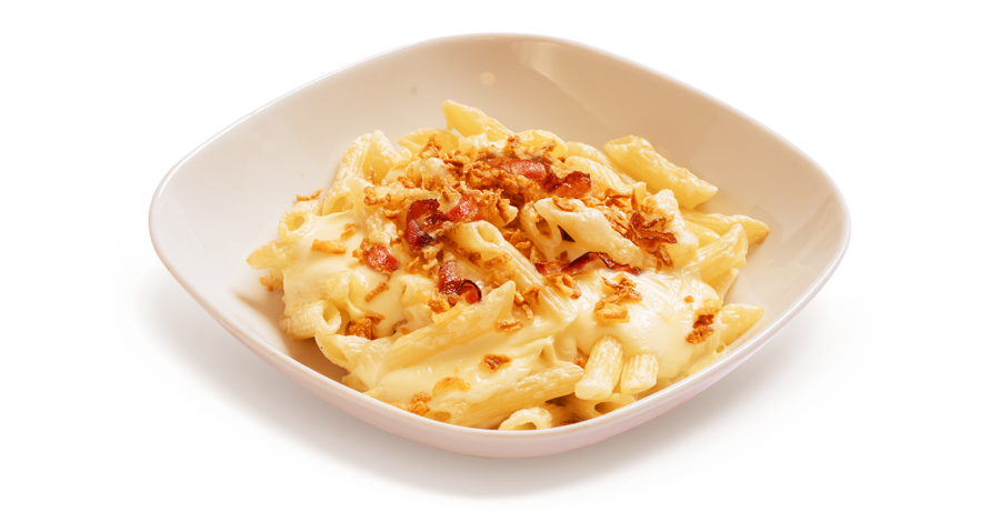 mit Penne (Makkaroni), Käsesoße, Baconstreifen, Freddys Gouda-Mozzarella-Mix und Röstzwiebeln